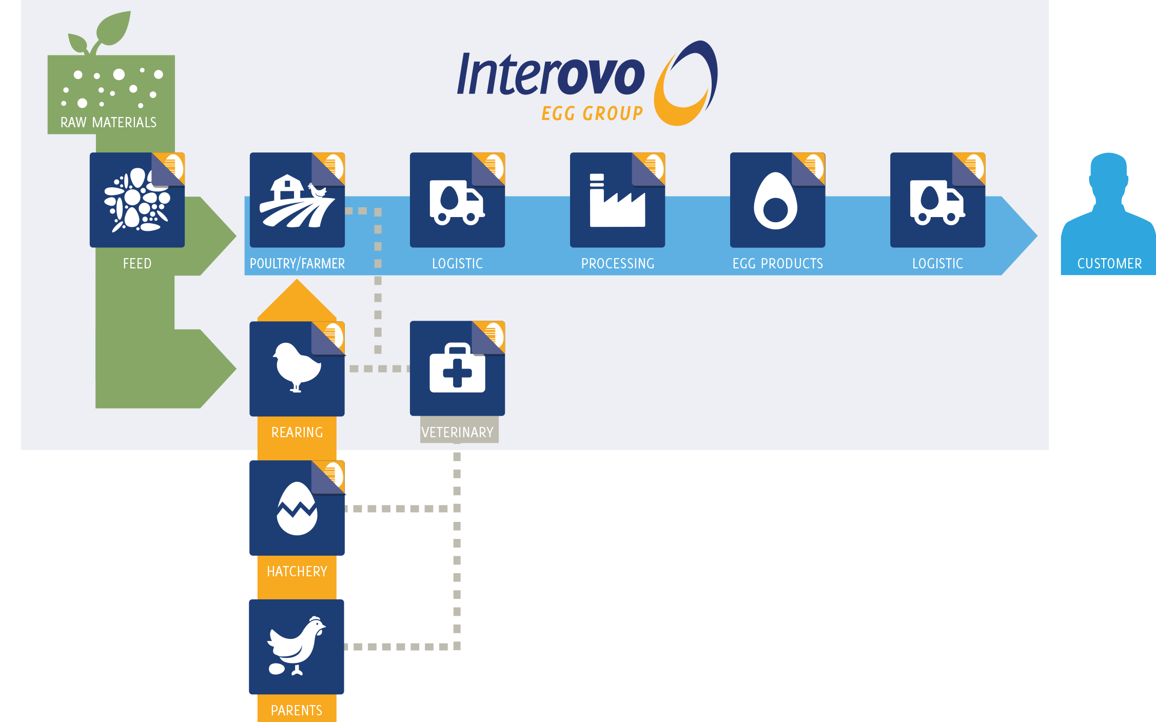 Pour la traçabilité des produits, les entreprises appliquent l’approche EggTraceBase®. Cette approche est appliquée depuis des années dans les entreprises d'Interovo Egg Group. En intégrant des maillons dans la chaîne, les entreprises comme les clients sont assurés à tout moment de disposer d’un produit sûr et traçable.